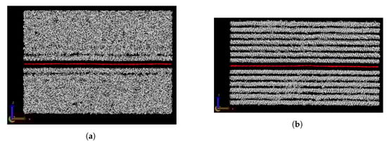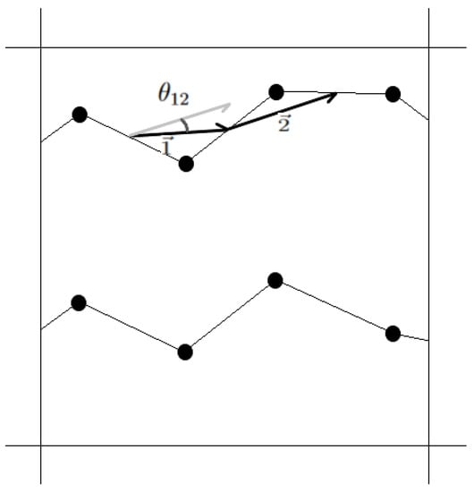 Crystallinity was measured with the method developed by Yamamoto [], altered slightly to obtain the per layer crystallinity. Instead of dividing the simulation box into sub-domains of roughly [] with the Lennard–Jones distance parameter (in this case, of carbon–carbon interactions), each layer is divided into sub-layers of an area roughly equal to . A schematic depiction is shown in Figure 1. Per sub-layer, the alignment of all chord vectors, which connect the mid-points of adjacent carbon–carbon bonds, is quantified by the orientational order parameter , defined using Legendre polynomials of the second order,