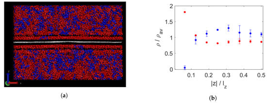 Figure 4a shows a composite of graphene with an even mixture of decane and triacontane. An aligned layer above and below the graphene can be distinguished even above the melting temperature, which seems to be composed mainly of triacontane. In Figure 4b, the segregation is quantified by means of relative densities, as described in Section 2. Indeed, we see that there is almost no decane present in the layer closest to the graphene. Furthermore, it is observed that the density of triacontane in this layer is enhanced due to the induced alignment of the molecules. Slightly further away, measured as a fraction of the computation box, there is still a somewhat lowered relative density of decane, while that of triacontane is slightly increased. In the rest of the molten wax, the remaining molecules are distributed without large density fluctuations and with some asymmetry, shown by the error bars.
