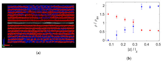 Bidisperse wax and a sheet of graphene (white) at 250 K (a). Long chains are shown in red, short ones in blue. In addition to the triacontane chains that had crystallised already at 350 K, now also the decane molecules have crystallised into layers. Segregation per layer, measured by normalised density per chain length (b). On the x-axis is the distance from the graphene sheet, divided by the box height l. The segregation has not changed compared to the semi-solid situation at 350 K shown in Figure 5b.