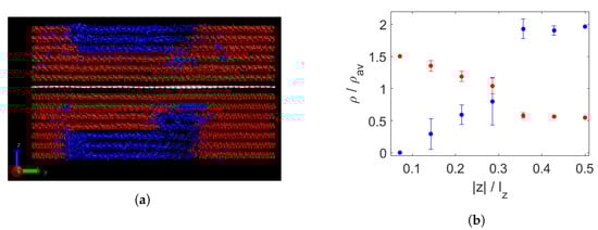 Luo et al. [] looked into the molecular weight segregation of bidisperse and polydisperse paraffin by quenching. While, for the polydisperse samples, they observed only weak segregation, the bidisperse wax did show clear segregation of chain lengths. In the current study, we used a much lower cooling rate of 0.1 K/ns. To check if the same results are obtained using this cooling technique, a mixture of 450 decane and 450 triacontane molecules was cooled down. Figure 2b shows that multiple regions of segregated molecular weights were formed, similar to those found by Luo et al. [].