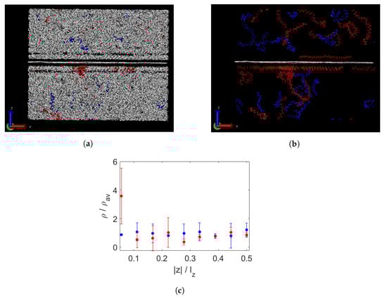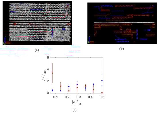 The composite containing polydisperse wax at 450 K is shown in Figure 7a. Some agglomeration of the longest chains is visible, seen more clearly in Figure 7b, where only the longest (red) and shortest (blue) chains are depicted. This is confirmed by the quantification in Figure 7c. These results are in agreement with the findings of Luo et al. [], who found weaker segregation in polydisperse paraffin as compared to bidisperse paraffin.