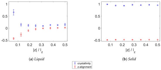 Apart from the segregation observed in bi-/polydisperse paraffin during cooling near a graphene sheet, the formation of crystalline structures is a striking aspect induced by the presence of the graphene sheet. This will be investigated next. Using a slightly altered version of the technique developed by Yamamoto [], the crystallinity of the various samples was measured per layer. In the case of molten wax, the box was divided into slabs with the same thickness as the aligned layer next to the graphene. In Figure 9, the crystallinity of the monodisperse eicosane wax is shown together with the alignment P of the molecules with the z-axis. In the molten state at 450 K shown in Figure 9a, the first layers above and below the graphene have significant crystallinity. The same goes for the z-alignment, which is still rather small (close to the minimum of −0.5) in the second layers from the graphene. At 350 K, as plotted in Figure 9b, all layers of wax have high crystallinity as well as large perpendicularity to the z-axis. Previous studies have shown that, because heat transport takes place mainly in the backbone [], the TC increases with crystallinity and alignment [,]. It is therefore expected that the wax will have an enhanced TC in the xy-plane and a lowered TC in the z-direction, as will be discussed later.