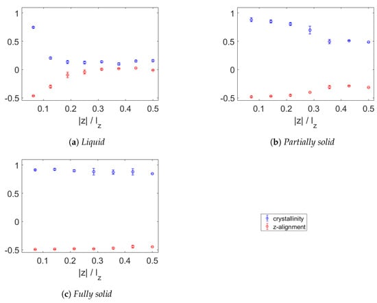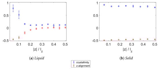 with being the angle between chord vectors and within the same sub-domain. The crystallinity of a layer is then defined as the fraction of sub-layers in which the alignment of the chord vectors is above the threshold value 0.7 as suggested by Yamamoto []. In addition to this, the alignment of all chord vectors contained in a layer, with the z-axis, is measured by