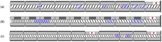 Two twin-screw extruders with screw diameters of 25 mm (Coperion ZSK 25 P8) and 45 mm (Barmag Saurer BTS-PET-045/40D) were used to investigate the transferability of the developed degradation model to other machine sizes. The PP compounds were processed on a ZE 28 BluePower twin-screw extruder from KraussMaffei with a screw diameter of 28 mm. Since the screw configuration can be assumed to have a small influence on the material degradation according to the findings of the previous studies, only one screw configuration was considered for each setup (Figure 1). The configurations mainly consist of conveying elements downstream of the plasticizing zone.