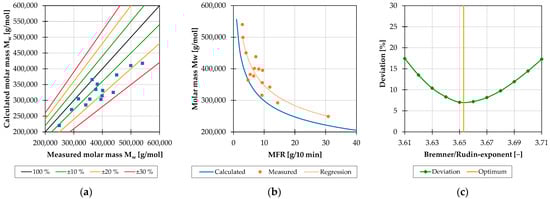 Deviation of the calculated from the measured weight-average molar masses (a); weight-average molar masses depending on the MFR value (b); mean percentage deviation of the calculated from the measured values as a function of the Bremner/Rudin exponent (c).