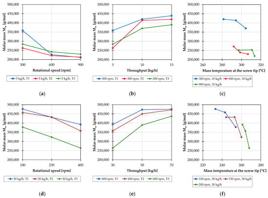Molar mass as a function of the parameters’ rotational speed (a), throughput (b) and mass temperature (c) for pure PP processed on the 25 mm extruder; molar mass as a function of the parameters’ rotational speed (d), throughput (e) and mass temperature (f) for pure PP processed on the 45 mm extruder.