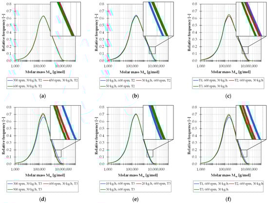 Molar mass distributions of the PP/TiO2 compound for different rotational speeds (a), throughputs (b) and mass temperatures (c); molar mass distributions of the PP/CF compound for different rotational speeds (d), throughputs (e) and mass temperatures (f).