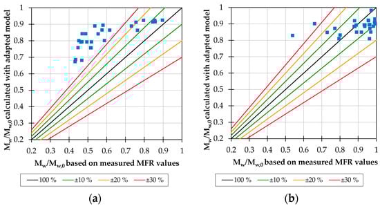 The result of the modeling with Equation (1) is the ratio of the reduced weight-average molar mass Mw at the particular operating point and the weight-average initial molar mass Mw,0. If no material degradation occurred, this molar mass quotient equals one. The higher the material degradation, the more the molar mass quotient approaches zero. For pure PP on the 25 mm extruder, all modeled values show an upward deviation according to Figure 6a. The deviation is greater for high material degradation than for low material degradation. One reason for the partially higher deviations is that the melt temperatures at some operating points were above the processing or decomposition range and consequently a disproportionately large material degradation takes place. For the 45 mm extruder, lower processing temperatures were used to stay within the recommended processing temperature at all test points. Consequently, the predicted values are more accurate (Figure 6b). Considering only the test points within the processing temperature for the 25 mm extruder, the accuracy would therefore also increase.