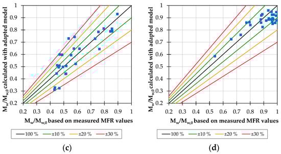 Deviation of the modeled molar mass quotients from the molar mass quotients based on the measured MFR values for pure PP on the 25 mm extruder (a) and the 45 mm extruder (b); improved accuracy of the model for the 25 mm extruder (c) and the model for the 45 mm extruder (d) through adaption of the process coefficients.