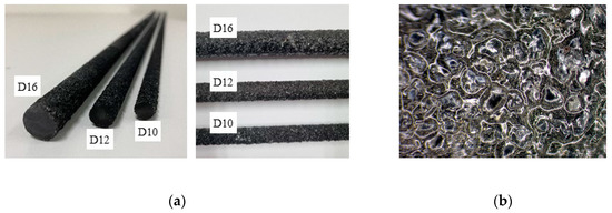 Sand-coated carbon fiber reinforced polymer rebar specimens with three different diameters. (a) Various sizes of CFRP rebar; (b) Surface of sand-coated CFRP rebar.