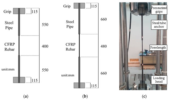 Figure 2a schematically presents the CFRP D10 rebar specimen fabricated for the tensile strength test. Figure 2a presents the CFRP D10 rebar specimens fabricated for the tensile strength test with a grip length of 550 mm, free length of 400 mm, and total length of 1500 mm. Figure 2b schematically presents the CFRP D12 and D16 rebar specimens fabricated for the tensile strength test with a grip length of 660 mm, free length of 480 mm, and total length of 1800 mm. Figure 2c presents the tensile strength test set-up whereby the load is applied in displacement control mode using a universal testing machine (UTM) with a capacity of 1200 kN at the rate of 3 mm/min.