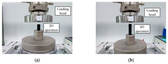 Compressive strength test set-up based on ASTM D695. (a) D12 (length 2 times diameter) test set-up; (b) D12 (length 4 times diameter).