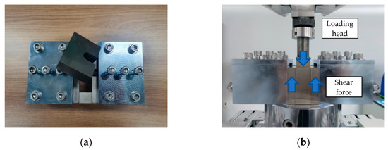 Shear strength test of CFRP rebar based on ASTM D7617. (a) shear jig; (b) test set-up.