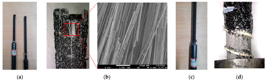 Figure 7 shows the tensile strength test specimens and the location and mode of failure. Figure 7a,c show that the CFRP rebar specimens fractured at the center and grip of the specimens, respectively. Figure 7b shows the fracture of the CFRP fiber at the center and that fiber weave is unidirectional. As the fiber weave is generated in one direction, the fibers of the CFRP rebar break sequentially, thus resulting in a brittle fracture. Figure 7d shows a fracture at the grip of the specimen.