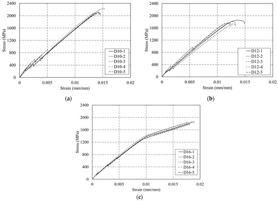 Figure 8a–c present the stress–displacement relationship of the D10, D12, and D16 CFRP rebar specimens, respectively. The results clearly indicate that CFRP rebar has no yield point. For the D16 specimens, an unexpected bilinear relationship was observed due to the slippage at the grip area. The average tensile strength value of the five D12 specimens tested is 1784 MPa. This value satisfies the standard tensile strength range of 600 MPa to 3690 MPa for CFRP rebar specified in ACI 440.1R-15 [2]. The average modulus of elasticity value is 158 GPa, which is also within the standard modulus of elasticity range of 120 GPa to 580 GPa for CFRP rebar specified in ACI 440.1R-15. Moreover, these results also satisfy the standard (KS F ISO 10406-1) modulus of elasticity value for CFRP rebar because the design guidelines (KS F ISO 10406-1) specify 140 GPa for FRP rebar. In addition, tensile strength tests of the five D10 and five D16 specimens show tensile strength values of 2116.7 MPa ± 58.47 MPa for D10 and 1831.3 MPa ± 33.19 MPa for D16.