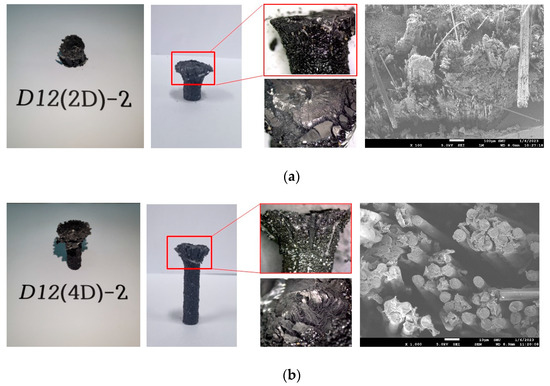 Figure 9a,b present photos of compressive strength test D12 specimens with lengths that are two times and four times their diameters, respectively, and their failure modes. All the CFRP D12 rebar specimens were crushed at the point where the load was applied, as shown in the figures. The fibers became separated from each other due to the failure of the resin rather than buckling.