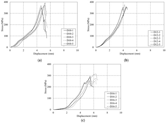Stress–displacement relationship of five shear strength test specimens. (a) D10; (b) D12; (c) D16.