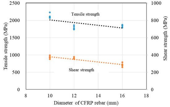 With an increase in the diameter of CFRP rebar, the tensile strength tends to decrease due to an uneven tensile stress distribution throughout the cross-section. This result is matched well with the experimental results in the literature [21]. Furthermore, unlike steel rebar, CFRP rebar has an orientation due to its fiber inclusion, and both the strength and stiffness of CFRP rebar vary according to the fiber content and resin used. Therefore, the tensile strength tests should be conducted using many specimens in order to ensure the reliability of the material’s mechanical performance. Similarly, the shear strength is significantly affected by the size of CFRP rebar due to the fiber matrix and resin. The shear strength is reduced as an increase in the CFRP rebar size as shown in Figure 12. Regardless of the CFRP rebar size, the tensile modulus of elasticity of CFRP rebars was higher than their compressive modulus of elasticity. The results are matched well with the findings in the literature [10].
