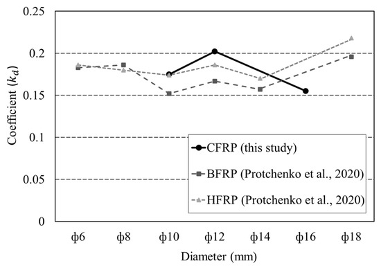 Calculated coefficients with respect to rebar diameter for sand-coated CFRP, basalt FRP, and hybrid FRP [21].