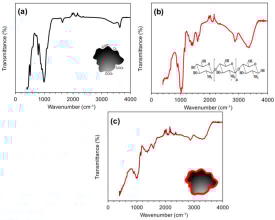 Figure 4b displays the FTIR spectrum of CS. The absorption bands noted at 3360–3300 and 2930–2860 cm−1 relate to the stretching modes of hydrogen-bonded O–H groups that overlapped with the stretching modes of free N–H moieties and the stretching modes of C–H groups, respectively [32,33]. The absorption bands observed at 2100–2000, 1600, 1440–1430, and 1395 cm−1 are related to the bending vibration modes of CH, NH2 scissoring, CH2, and C–O–H groups, respectively. The predominant adsorption bands recorded at 1065–999 cm−1 are assigned to the stretching vibration modes of C–N groups overlapped with the stretching modes of the C–O–C group [34,35]. As a result of the grafting of CS on the AC surface, a shift in the absorption band of the N–H group to a lower wavenumber was observed (see Figure 4c). In addition, the band intensity of the free N–H group was decreased and broadened. Moreover, the IR spectrum of the composite showed the absorption bands of both CS and AC. These results suggested a successful interaction between CS and AC.