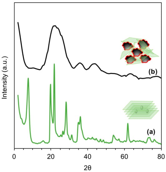 X-ray Diffraction patterns of: (a) pristine AC, and (b) delaminated AC.