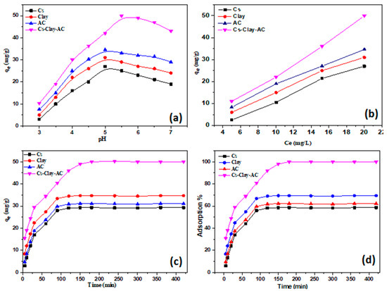 The solution pH is a vital variable that affects the uptake process. In Figure 6a, the impact of the initial pH value on the uptake of Pb2+ ion was shown. It should be noted that Pb2+ ion adsorption capacity was attained at pH 5.5. At a low pH, the nanocomposite surface was loaded with a positive charge owing to the protonation of amine moieties. In addition, a significant electrostatic repulsion occurred between the composite surface and the Pb2+ ion solution resulting in minimal desorption. However, as the solution’s pH increases, the formation of metal hydroxides leads to a decrease in the efficiency of Pb2+ ion removal [22]. The adsorption capacity for CS, MMT, AC, and MMT/CS/AC composite at pH 5.5 was 27, 31, 34.5, and 50 mg/g, respectively. In subsequent studies, pH 5.5 was thus accepted.