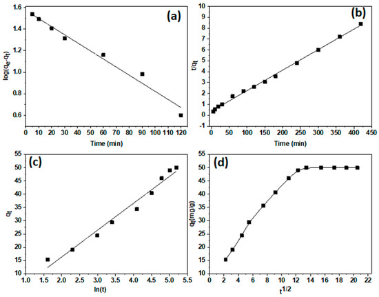where the pseudo first-order and pseudo second-order rate constants are k1 (min−1) and k2 (g mg−1·min−1). Qe and Qt (mg g−1) are the same as above. It is possible to calculate the constants α and β from the Temkin plot (Figure 7 and Table 1).