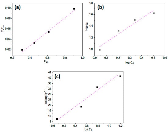 where the amount of Pb2+ ion adsorbed at equilibrium (mg/g) and the concentration at equilibrium (mg/L) are Qe and Ce. Kf (mg/g) and n are the Freundlich constants given respectively to the adsorption capacity and intensity. Qm is the highest adsorption amount (mg/g), and kL is the adsorption energy-related Langmuir constant (L/mg). AT is the equilibrium binding constant, (L/g), bT is the adsorption constant (J/mol K), and B is the heat of sorption-related constant (J/mol). The small correlation factor (r2) of Freundlich and Temkin isotherms shows that they do not match both models, as shown in Figure 8 and Table 2. In contrast, the synthesized MMT/CS/AC composite’s Pb2+ ion adsorption data fit the Langmuir isotherm with the highest regression factor. Finally, the fitting of experimental data allows the ordering of Langmuir, Freundlich, and Temkin by the regression factor (r2) of different isotherms. These findings show that the combination of the individual constituents of the composite favors the Pb2+ ion’s adsorption in a monolayer coverage [41]. It is, therefore, practical to use MMT/CS/AC composite as adsorbents for the cleaning process with a notable tailored structure.