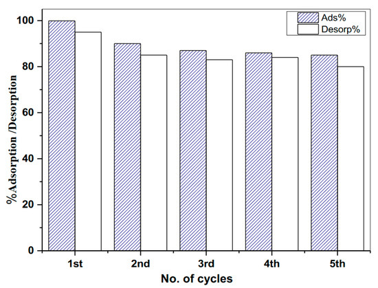 For sophisticated adsorbent materials, recycling, and reusability are significant considerations. According to the pH survey, removing Pb2+ ions on the composite was low at smaller pH values, meaning that the removed Pb2+ ions can be detached in an acidic medium from the synthesized composite. An acidic solution of HCl (0.1 mol/L) was used in the desorption process because of the petite sizes of the chloride’s ions compared to other counter ions. As shown in Figure 9, a cycling experiment was repeated five times using the same Pb2+-loaded MMT/CS/AC composite. The MMT/CS/AC composite maintained a high capacity of adsorption throughout the fifth adsorption-desorption cycle.
