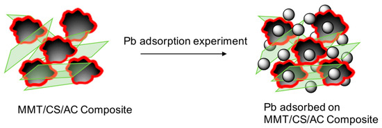 Schematic illustration of Pb adsorption on the formed MMT/CS/AC composite.