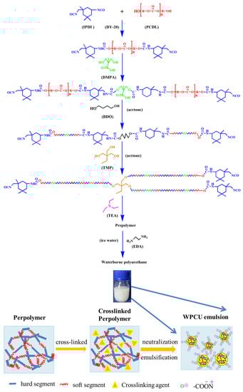 After the system was cooled to 40 °C, acetone was added to adjust the viscosity. Subsequently, BDO was added as the chain amplicon, heating the system to 60 °C and reacting for two hours. Afterward, TMP was used as a cross-linking agent to respond with the unreacted NCO groups at 60 °C for one hour. Eventually, the TEA was added to react with -COOH for 30 min at 35 °C. The solid content of the waterborne polyurethane emulsion was fixed at 35%. After the reaction, the mass of the deionized water was calculated from the total mass of the reagent. Then, the quantitative deionized water and defoamer were added to the prepolymer slowly at high-speed agitation (1000 rpm) under an ice-water bath. Eventually, the addition of EDA as a posterior chain amplification agent completely reacts with the remaining -NCO in the system. The reaction process and the cross-linking mechanism of WPCU are shown in Figure 1.
