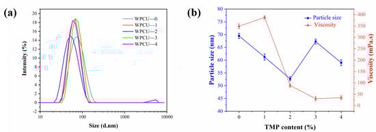 (a) Particle size distributions of WPCU emulsions; (b) Particle size and viscosity of WPCU emulsion with different TMP contents.