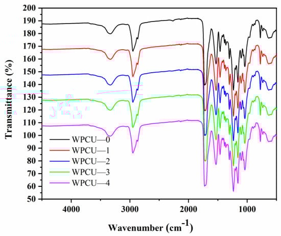 The FTIR spectra of the WPCU film are shown in Figure 4. The spectra of WPCU-0 to WPCU-4 were very similar. The peaks at 3333 cm−1 were attributed to the tensile vibration of N-H of amide bonds [41]. The absorption peaks near 2860~2940 cm−1 were attributed to the alkane groups’ C-H stretching vibration [42]. Furthermore, the absorption peak near 1726 cm−1 was assigned to the stretching vibration peak of C=O bonds from the urethane groups [43]. A sharp and characteristic peak at 1530 cm−1 was the bending vibration absorption peak of the N-H bond in the amide bond. Several peaks at 1060~1255 cm−1 are related to the C-O-C tensile vibration in the urethane groups [44]. Moreover, the asymmetric stretching vibration peak of -NCO near 2270 cm−1 ceases to be visible for all WPCU, indicating that all -NCO groups are depleted and the termination reaction is complete [45].