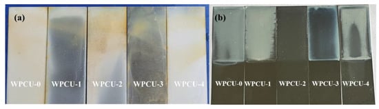 The water and alcohol resistance properties of the WPCU-0 to WPCU-4 films are shown in Figure 7. As shown in Figure 7a, When the TMP content was 3%, the coating had the best water resistance. When the TMP content continues to increase and the BDO content continues to decrease, the water resistance of the coating decreases. This trend may have resulted from the film formation defects, and it was easier for water to enter the interior of the layer. In Figure 7b, from the whitening of the coating, when the TMP content was less than 2%, the WPCU film was severely whitened after immersion in 50% ethanol solution for 2 h. WPCU-2 and WPCU-3 showed good alcohol resistance. To sum up, the formation of the cross-linked structure is beneficial to the increase of the water resistance and alcohol resistance of the film.