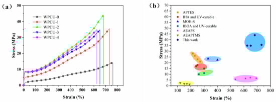 (a) Tensile-strain curves of WPCU films and (b) comparison of mechanical properties with reported papers.