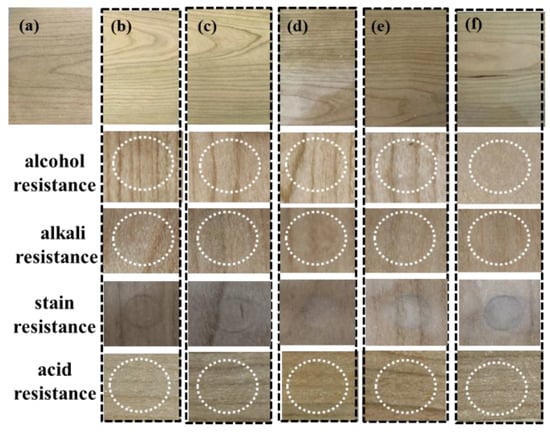 (a) Wood surface without wood lacquer; (b–f) Surface and performance test of wooden boards coated with WPCU-0, WPCU-1, WPCU-2, WPCU-3, and WPCU-4 wood lacquer.