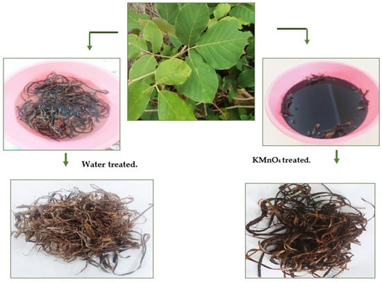 Butea parviflora (BP) is a woody climber belonging to the Fabaceae family. It is found in the regions of Kanniyakumari, Tamil Nadu. The whole plant is fibrous, but the strength and texture vary from the outer to inner space. Due to its strength, bark fibers of Butea plant are used by locals for tying, knotting, and binding requirements. Bark contains 1% rotenone, which is used as an insecticide. In order to separate mature fibers from the plant, a metal teeth tool is used. Collected fibers are treated in distilled water and potassium permanganate; treatment involves soaking of fibers in 0.1 M NaOH solution for 20 min, followed by 15 min in the same molarity of potassium permanganate at 27 °C. Treated fibers are rinsed in distilled water. Fibers are first drained in shade, then dried completely using a vacuum desiccator. Variation in soaking time and concentration of KMnO4 will bring varying results. Different treatments at 0.025% and 0.05% of KMnO4 on the Musa plant eliminated the non-cellulosic debris and manifested the crystalline and tensile property of fiber. The delignification process that takes place during permanganate action facilitates the rearrangement of microfibrils, resulting in an improvement in crystallinity. Moreover, the wetting of fibers in 0.1% KMnO4 induces capillary forces that increase their resistance to water [18]. Figure 1. presents water and KMnO4 treated BP fibers.