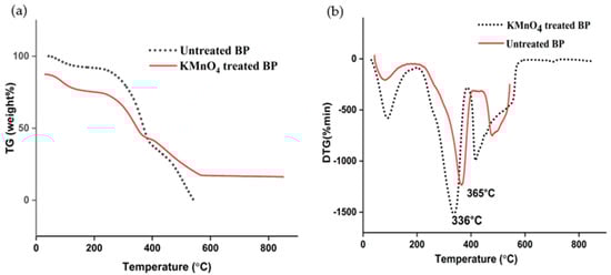DTG curve revealed a significant disintegration peak at 336 °C, registering the removal of cellulose, closely matching the TG curve. The degradation peak for the raw BP was extended to 366 °C, higher than the KMnO4-treated fibers. Loss of lignin happens around 280–500 °C. Considerable loss of lignin nurtures thermal viability. However, chemical modification wiped out most lignin from the fiber arrangement leading to the earlier arrival of degradation temperature in the KMnO4-treated fiber than the raw BP. A comparison analysis showed that, among the fire retardant, rot retardant, water retardant, and raw jute fibers, raw fibers had the highest decomposition temperature [53]. In addition, incremented heat transfer to fibers would minimalize the melting heat, and it was noted to be lower in treated textile fiber than the untreated fiber [54]. These facts could have ignited the early decomposition in the permanganate-treated BP. The oxidation of hydrogen bonds between cellulose and hemicellulose caused by KMnO4 treatment has led to the formation of cellulose manganate complex [18]. This might have stretched the thermal stand by a temperature up to 240 °C. Similar degradation peaks were noticed in jute (365 °C), sisal (347 °C) and buriti (334 °C) [41].