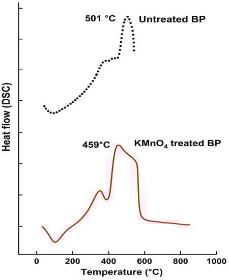 DSC profiles of untreated and KMnO4-treated BP fibers are portrayed in Figure 4. A wide range of components move out from BP at varying temperatures. Moisture is the chief entity that gets removed within the first level of heating, all over 100 °C. In the KMnO4 treated BP, heat absorption left a peak around 400 °C, indicating the exemption of cellulose. Lignin takes a wider degradation rate as it is composed of numerous O2 functional group structures with diverse heat stability [55]. An exothermic peak at 459 °C liberated the lignified compartment from the treated BP. However, raw BP showcased an extended exclusion of lignin around 501 °C. Thermal behavior of BP fibers is listed in Table 4.