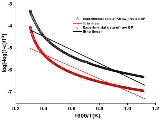 A linear plot between log [−log(1 − α)/T2] and 1000/T estimated the activation energy Ea, which is the prime factor in fixing the thermal stability of reinforcement. Kinetic activation energy for the permanganate-treated fibers are 62.80−63.46 KJ/mol, which is lower than the untreated BP 73.15 KJ/mol. Thermal stability of biofibers are projected through their degradation temperatures. Higher bond energy results in improved thermal stability and activation energy [56]. Thermal stability is dominant in the raw BP, and so Ea of permanganate-treated BP is lower than the raw BP. Ea curve is plotted in Figure 5.