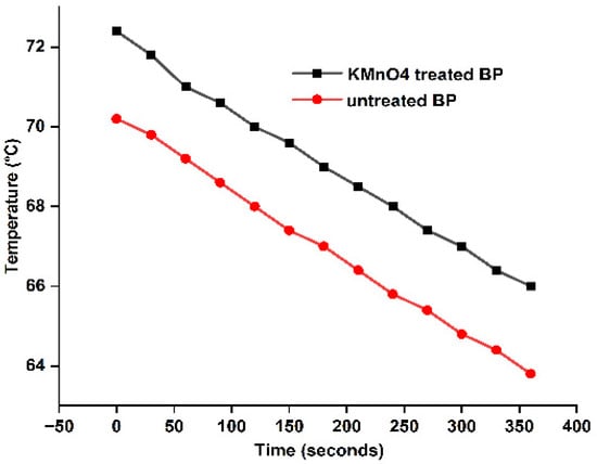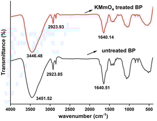 A peak rise in the area 646.78 cm−1 is involved in CS stretching [28]. Specific minor variations in peaks are observed for permanganate-treated BP, since several functional groups of amorphous constituents had removed during KMnO4 action. Vibrations differing for untreated and permanganate-treated BP are spotted in Table 5 [69,70,71,72].