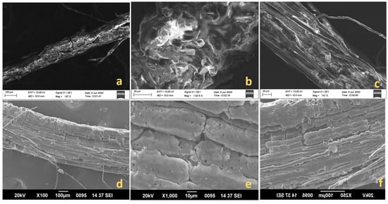 Surface morphologies are diligent while considering fibers to be paired with matrix. Figure 7a–f. show the surface variations in raw and treated fibers, respectively. Raw fibers show projections on their surface, and fibrils are seen to be clouded with impurities, wax, hemicelluloses, and lignin. Microfibrils are unevenly oriented along the long axis. The presence of cellulose imparts a rough texture [62]. Figure 7b shows a flared structure in the raw BP, which could be easily distinguished from the ordered arrangements of treated BP. KMnO4 action on the fibers might have eroded the amorphous constituents by breaking the linkage between the cellulose and hemicelluloses [63]. However, micrographs of permanganate-treated BP display a shallow depression along the long axis [64,65]. Fine pores appearing on the surface could indicate a good bonding between the reinforcement and matrix for composite-making [6]. The longitudinal arrangement of cellulosic components in Figure 7d of treated BP was more aligned than the raw BP in Figure 7a. Surface sections of KMnO4-treated BP was nearly rod-shaped, which resulted in the dismissal of linking agents within the BP’s fiber space [42].
