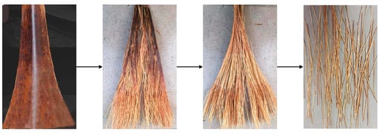 Figure 1 shows the extraction process of coconut petiole fibers. First, coconut petioles were dried and knocked to separate coconut petiole fibers. Coconut petiole fibers were cut short and washed thoroughly in deionized water to eliminate unwanted impurities such as dust. The CPFs were dried in an oven for 8 h at 80 °C to remove water.