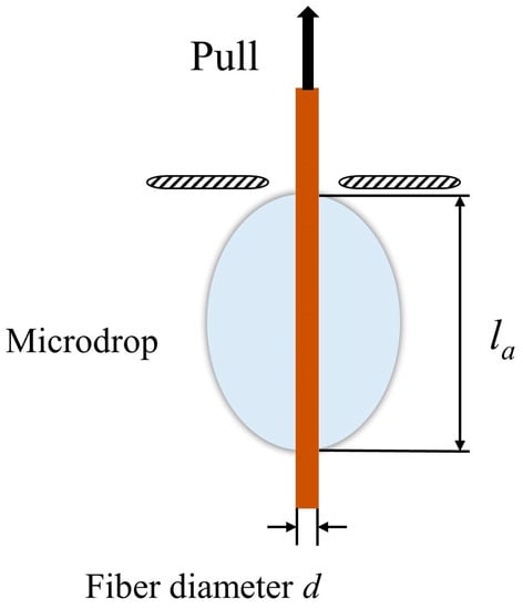 The microdroplet debonding experiment was performed by the universal testing machine. PLA was melted into droplets and wrapped around one end of the fiber. The other end of the fiber passed through the fixture with holes. The fiber was able to pass through the fixture while the PLA droplets were not [35]. In Figure 2, it was observed that when tension was applied at one end of the fiber, the fiber could be pulled out of the droplets. The tensile rate was 0.5 mm/min. The interfacial shear strength (IFSS) σi was calculated by the following equation: