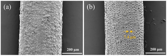 The surface morphology of CPFs and ACPFs is reported in Figure 3. CPFs were impregnated with a waxy external layer. This observation was typified in the investigation carried out by Ye et al. [36]. After alkali treatment, the waxy external layer was removed and the diameter of the fiber was smaller. The surface of ACPF was rougher with a large number of holes in micron–sized due to the removal of impurities from the fibers after alkali treatment, as illustrated in Figure 3b. This special porous structure was not found in known plant fibers such as sisal and coir fibers [37]. The dense holes facilitated the penetration of the resin into the fiber surface, thus improving the interfacial adhesion between the ACPFs and the matrix [38,39].