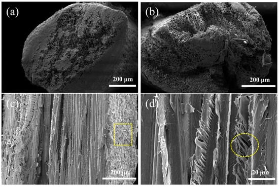 Figure 4 shows the sectional morphology of CPFs and ACPFs. The fibers were composed of a series of microfiber bundles as reported in Figure 4a,b. This structure of CPFs and ACPFs had similarities to that of sisal fibers in work completed by Lv et al. [32]. Compared to the CPFs, the binding components on the surface of the ACPFs as well as the binding components between the fiber bundles were removed and there was a slight collapse of the fiber bundles. The cross–section of the ACPFs was rough, and many grooves appeared, which was typified in the investigation carried out by Vijay et al. [40]. The longitudinal section morphology of the fibers might offer further information about the structure of the fibers. The microfibers presented an obvious spiral–pattern structure in Figure 4c,d. This special helical structure might have a significant impact on the mechanical properties of the fibers. When the fibers were pulled in tension, these microfibers might uncoil like springs with bending and twisting, thus giving the fibers a certain degree of tensile toughness.