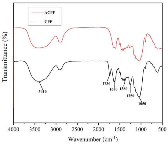 Figure 5 shows the FT–IR spectrum of CPFs and ACPFs. For CPFs, there were broad peaks at 3410 cm−1 and 1050 cm−1, and prominent peaks at 1736, 1630, 1380, and 1250 cm−1. According to Picard et al., the peak at 3410 cm−1 was characteristic of the stretching vibrations of O–H [41]. In addition, the peak at 1050 cm−1 was assigned to the C–O–H stretching in cellulose and hemicellulose. The peak at 1380 cm−1 represented the flexural vibration of C–H attributed to hemicellulose and cellulose. Furthermore, the peak at 1736 cm−1 represented the C=O stretching modes in hemicellulose and cellulose. The peak at 1736 cm−1 represented the conjugated C=O stretching vibrations in lignin. In addition, the peak at 1250 cm−1 represented the C–O stretching vibrations in lignin. Cellulose, hemicellulose, and lignin were confirmed to be present in CPFs by FT–IR analysis.