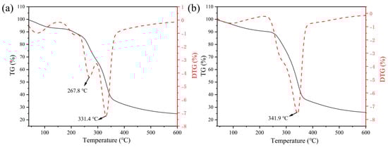 At higher temperatures (200–400 °C), up to 70% or more of fiber mass may be lost due to the decomposition of hemicellulose, cellulose, and lignin. As can be seen from Figure 6a, there were multiple peaks due to surface impurities and some components not being removed. The CPFs had a thermal decomposition peak at 267.8 °C, which was caused by the decomposition of hemicellulose. Hemicellulose was the first chemical component to decompose due to its amorphous structure in the fiber, and its decomposition temperature was usually in the range of 200–300 °C [50].