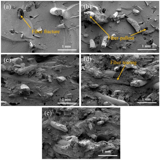 SEM reflects a clear picture of the interfacial adhesion, fibers distribution, and failure modes. For this purpose, SEM of PLA/ACPF composites with different fiber loadings of 10, 20, 30, 40, and 50 wt.% was carried out and the images are presented in Figure 7. It was seen that the matrix packed the ACPFs closely, and there was good interfacial bonding between them. Figure 7a shows that the fibers were not uniformly distributed in the matrix when the fiber content was low. The cross–section was flat, and only a few fibers were pulled out or broken. With the gradual increase of fiber loadings, as shown in Figure 7c–e, the fibers were randomly and irregularly distributed in the matrix. There were more fibers pulled out or broken. Some fibers parallel to the fracture surface were torn or pulled out laterally. The cross–section became uneven. Figure 7e depicts a lower void content within the composites. Some of the fibers were connected to each other. Additionally, Figure 7e shows that when the fibers were pulled out, the surface was partially coated with PLA matrix, indicating good interfacial adhesion between them. A stress transfer network was formed within the composites, which facilitated the transfer of loads.