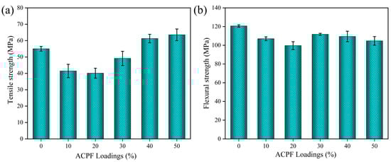 The ultimate strength of PLA/ACPF composites with different fiber loadings: (a) tensile strength and (b) flexural strength.